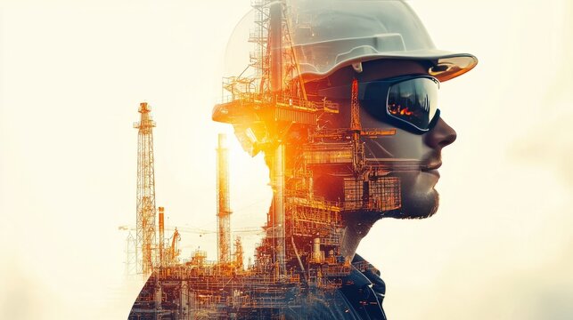 Engineer with Safety Helmet Overlaid on Oil Rig and Industrial Background