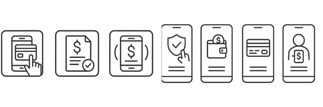 Set of web icons representing online payment processes and transactions across different devices