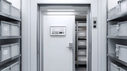Clinical white medical sample storage unit with labeled compartments, temperature control panels, and secure shelving