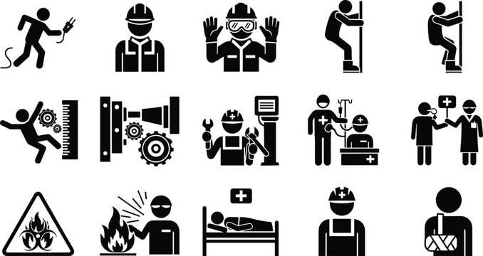 Workplace safety hazard icons set, industrial accident prevention symbols, worker injury illustrations, construction safety signs, first aid emergency vector collection