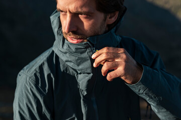Composed outdoor adventurer securing technical jacket for calm mountain exposure