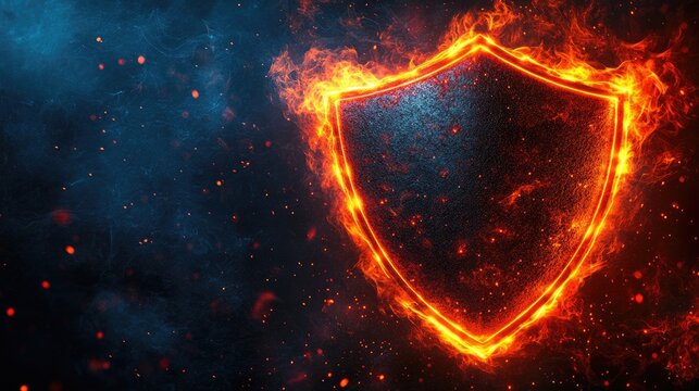 Metallic shield engulfed in powerful flames on a dark, smoky background. For security firms, gaming sites, fantasy art, or articles on robust defense and resilience.