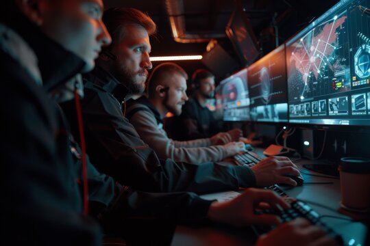 A group of cyber security professionals in a high-tech office, utilizing holographic data to manage and mitigate AI-based threats