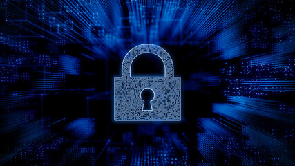 Security Technology Concept with lock symbol against a Futuristic, Blue Digital Grid background. Network Tech Wallpaper. 3D Render