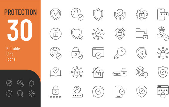 Protection Editable Icons set. Vector illustration in modern thin line style of security related icons: shield, lock, guard, and more. Isolated on transparent background.