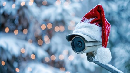CCTV camera with Santa hat for outdoor security and holiday theme