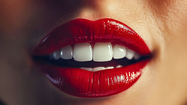 Extreme close up of glossy crimson lips with a slight pout and sensual appeal, illuminated by dramatic purple and pink lighting creating a luxurious and seductive mood