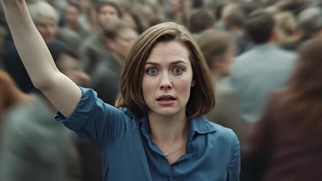Anxious Woman with Wide Eyes Reaching Out in a Blurred Crowd, Conveying Fear and Panic Amidst Anonymous Faces