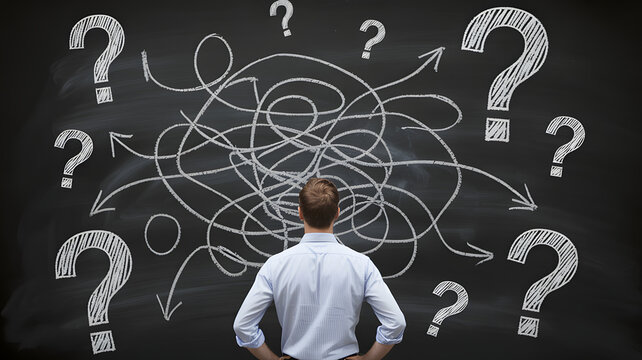 Person surrounded by many question marks seeking answers and solutions for life's challenges