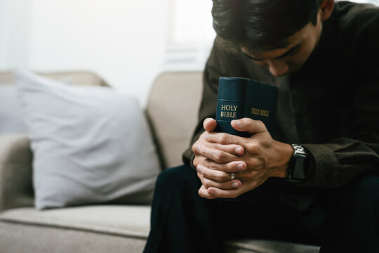 Christian pray and worship god with belief and spirituality. Hand praying and praise with the holy bible in church. young man prayer confession sin for seeking peace relationship in Jesus christ