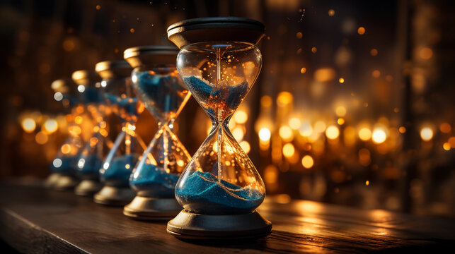 A closeup of an hourglass with golden sand flowing, set against a dark background with bokeh lights and glitter effect, copy space