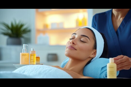 Relaxed woman lying in spa with skincare bottles, concept of wellness and rejuvenation, ideal for beauty advertising or cosmetic product campaigns