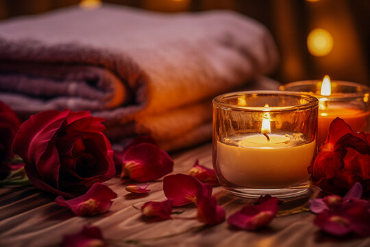 Tea lights, candle holder, towel and flower petals. Cozy display of lanterns, candlelights, on warm background. Spa, self care or romance concept.