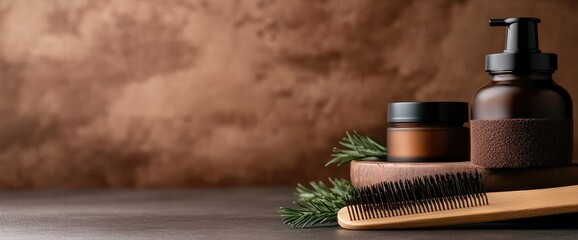 Natural health products and tools arranged on table, featuring wooden brushes, herbal capsules, and green plants, creating calming and wellness focused atmosphere
