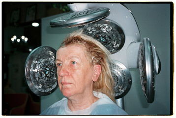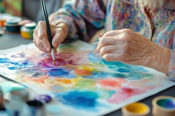 An elderly woman engaged in a painting activity at a care facility, promoting creativity and expression