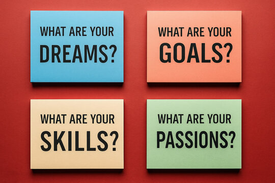 Inspirational Questions on Colorful Cards Asking About Dreams, Goals, Skills, and Passions