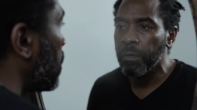 Close up of a thoughtful black man with dreadlocks looking at his reflection in a mirror while touching his face