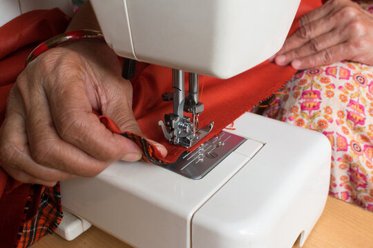 Close up view of female hands stitching fabric on sewing machine  at workplace or home. Hands holding textile for dress production. Concept of self employment woman and Female entrepreneurs in India.