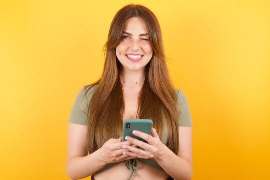 Portrait of Caucasian woman wearing green shirt standing against yellow background taking a selfie  celebrating success