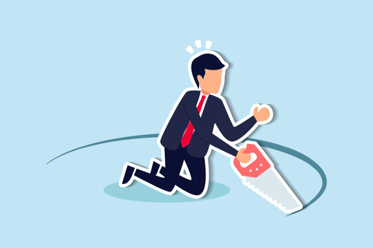 Business or financial errors worsen situations due to wrong decisions or foolishness concept, foolish frustrated businessman sawing the floor to self sabotage or make himself fall with failure.
