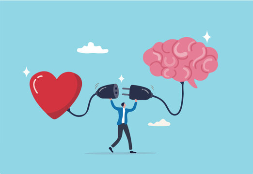 Emotional Intelligence, EI or control feeling and emotion with logical thinking brain, empathy or social skill, self control or balance concept, man connect heart feeling with logical thinking brain