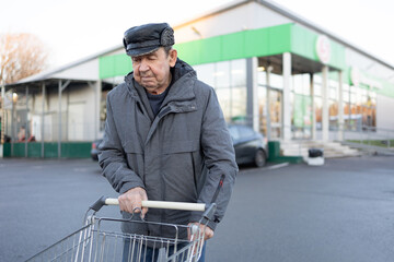 Senior man in winter jacket placing food bags from shopping cart into open car trunk on parking lot in cold season.