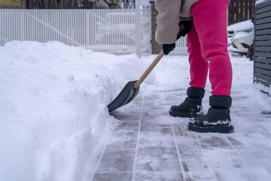 Female clears snow from sidewalk using shovel in suburban area. Woman shoveling snow from driveway after heavy snowfall near private house. Homeowner responsibility, winter weather cleanup.