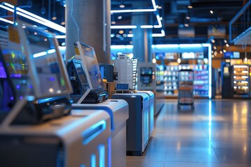 Hightech checkout area with automated carts and selfservice kiosks, featured against a modern, metallic background, perfect for demonstrating the future of retail technology