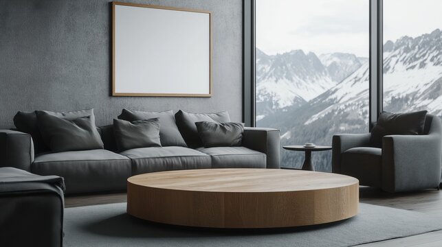 Mesa baja redonda de madera cerca del sofá y sillón contra la ventana y la pared con un marco de póster en blanco. Diseño interior escandinavo de sala de estar moderna.
