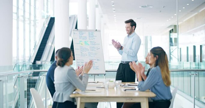 Group of diverse business people clapping and celebrating success during a presentation. Team of workers together, attending office seminar. Conference attendees applaud a corporate training seminar