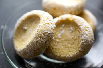 Moroccan semolina and almond cookies on plate, close-up