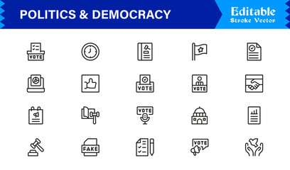 Politics and Democracy line icon set, modern professional vector collection of government, voting, civic rights, election, and policy-related minimal outline illustrations.