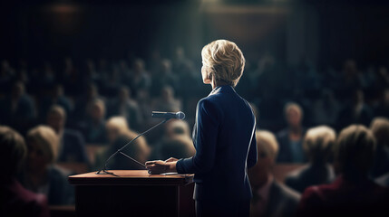 Silhouette of the American senator giving a press conference at the podium, with white spotlights