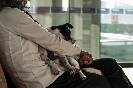 gray hair woman sitting at airport terminal waiting lounge or at gates with her pet, jack russel dog on laps, travelling with pets by plane