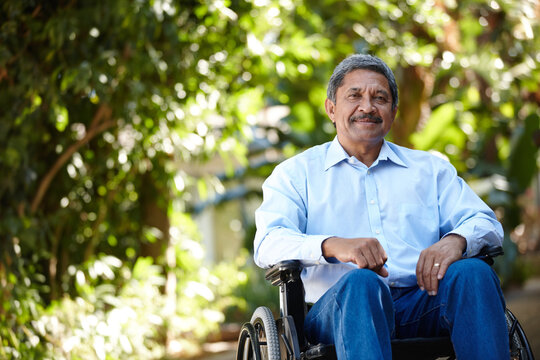 Elderly man, wheelchair and smile in park, portrait and outdoor with injury, recovery and relax in nature. Senior person with disability, rehabilitation and happy at retirement village in Malaysia