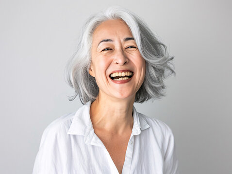 A joyful senior man stands in front of an orange background, laughing heartily while wearing a casual checkered shirt. His expression shows excitement and warmth, enhancing the cheerful atmosphere.