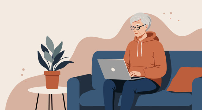 Senior woman comfortably using a laptop on a sofa at home, representing digital connection, online learning, and a modern relaxed lifestyle for older adults.
