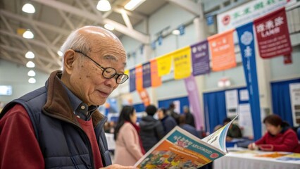 A wiselooking elder with round glasses is perusing a colorful brochure at a local health fair. The booth right behind him showcases parttime job openings for healthrelated