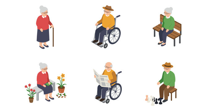 Elderly activities: isometric seniors engaging in various leisure pursuits