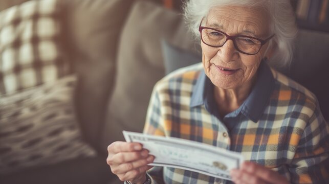 Senior citizen holding check symbolizing social security benefits, smiling with relief in cozy home setting, representing financial security and peace of mind