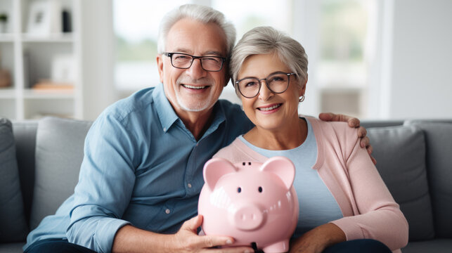 Senior couple and pink piggy bank on wooden table with white wall background. Money financial management, pension, savings planning, deposit account for elder or retirees, aging society, ira concept.