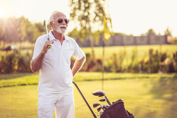 Portrait of wealthy senior golfer with golf clubs enjoying free time outdoors.