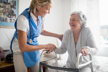 Young caregiver helping senior woman walking. Nurse assisting her old woman patient at nursing home. Senior woman with walking stick being helped by nurse at home., no logos, no brands