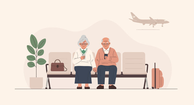 Senior Couple Waits For Flight At Airport Terminal Holding Smartphones