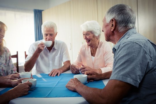 A joyful group of seniors gathers in a retirement nursing home, playing cards and sharing hearty laughter, fostering camaraderie and creating a warm and lively atmosphere in the community living space