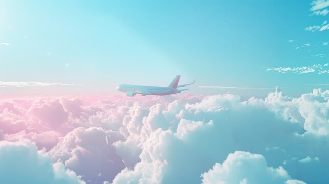 Airplane flying over clouds, embodying global travel, tourism, and leisure, clear summer sky background, concept of holiday planning, vibrant colors, wide angle, AI Generative hyper realistic