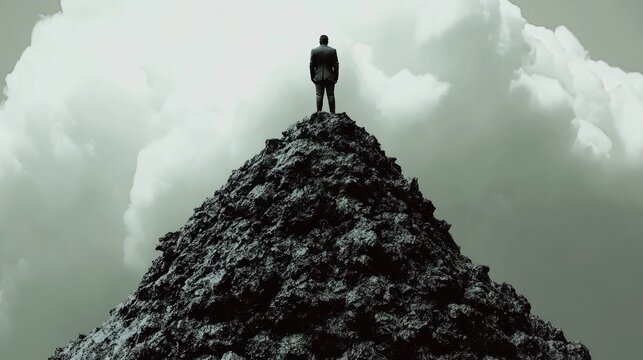 A man in a suit stands on top of a rocky mountain, looking out at a cloudy sky. The image evokes a sense of achievement and solitude.