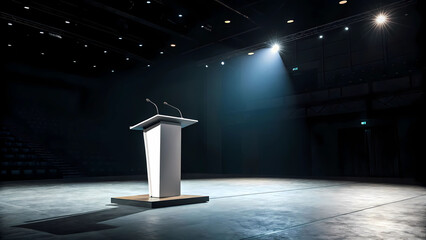 A modern minimalist podium on a vast, empty stage under a single dramatic spotlight. The background is in deep shadows, creating a sense of anticipation and importance. Cinematic lighting,