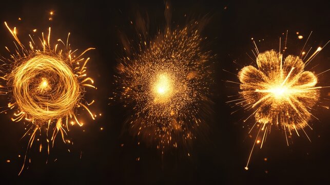 13.A collection of four golden fireworks captured mid-explosion, each with unique patterns of radiant streaks and glowing embers, designed to evoke a sense of celebration and excitement.