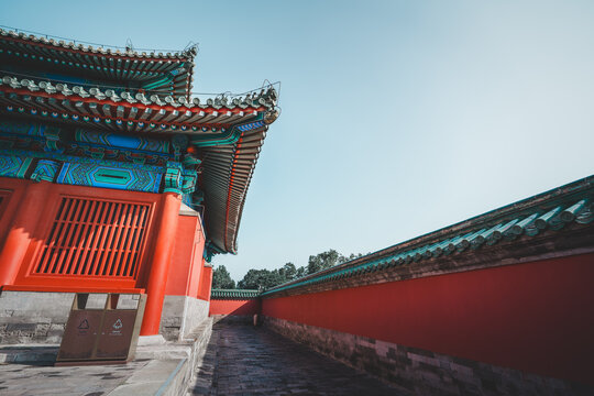 Golden-roofed structures within the Beijing Temple of Heaven complex display intricate, symmetrical patterns against a blue sky, conveying a sense of imperial grandeur and reverence.